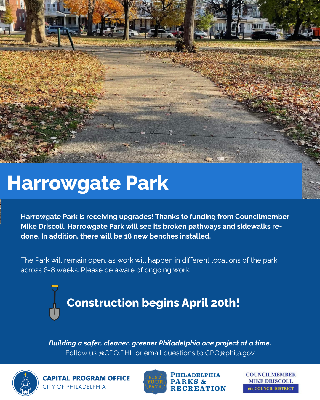 Today, Harrowgate Park is easily reached by bus, Market-Frankford El line (Tioga Station), or bike. Harrowgate Park is owned by the City and under the management of the Department of Parks & Recreation.